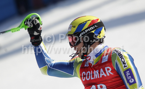 : Mitja Valencic of Slovenia reacts in finish of second run of Men slalom race of Audi FIS alpine skiing World Cup 2010-2011 in Kranjska Gora, Slovenia. Men slalom race of FIS alpine skiing World Championships, was held on Sunday, 6th of March 2011, in Kranjska Gora, Slovenia.