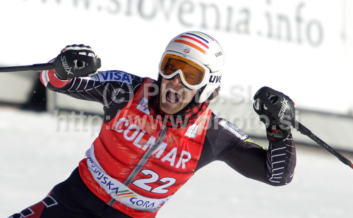 Kranjska Gora ,Slovenia - 06.03.2011 : Second placed Nolan Kasper of USA reacts in finish of second run of Men slalom race of Audi FIS alpine skiing World Cup 2010-2011 in Kranjska Gora, Slovenia. Men slalom race of FIS alpine skiing World Championships, was held on Sunday, 6th of March 2011, in Kranjska Gora, Slovenia. Photo by: Primoz Jeroncic