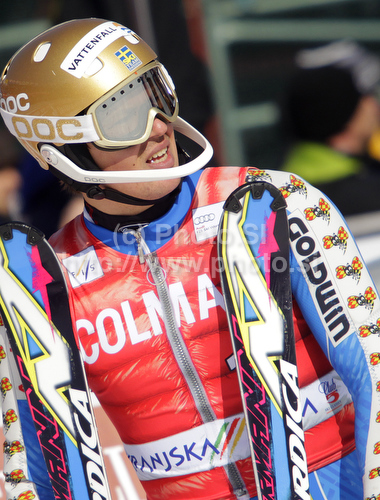 : Fourth placed Andre Myhrer of Sweden reacts in finish of second run of Men slalom race of Audi FIS alpine skiing World Cup 2010-2011 in Kranjska Gora, Slovenia. Men slalom race of FIS alpine skiing World Championships, was held on Sunday, 6th of March 2011, in Kranjska Gora, Slovenia.