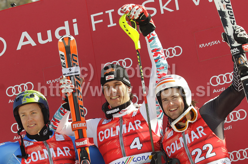 : Winner Mario Matt of Austria (M), and second placed Axel Baeck of Sweden (L) and Nolan Kasper of USA (R) celebrate their medals won in Men slalom race of Audi FIS alpine skiing World Cup 2010-2011 in Kranjska Gora, Slovenia. Men slalom race of FIS alpine skiing World Championships, was held on Sunday, 6th of March 2011, in Kranjska Gora, Slovenia.