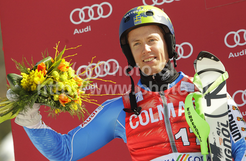 : Second placed Axel Baeck of Sweden celebrates his medal won in Men slalom race of Audi FIS alpine skiing World Cup 2010-2011 in Kranjska Gora, Slovenia. Men slalom race of FIS alpine skiing World Championships, was held on Sunday, 6th of March 2011, in Kranjska Gora, Slovenia.