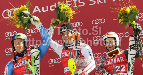 : Winner Mario Matt of Austria (M), and second placed Axel Baeck of Sweden (L) and Nolan Kasper of USA (R) celebrate their medals won in Men slalom race of Audi FIS alpine skiing World Cup 2010-2011 in Kranjska Gora, Slovenia. Men slalom race of FIS alpine skiing World Championships, was held on Sunday, 6th of March 2011, in Kranjska Gora, Slovenia.