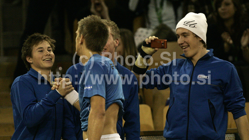 : Jarkko Nieminen of Finland celebrates his victory with his teammates after match of Davis Cup between Slovenia and Finland. Match between Jarkko Nieminen of Finland and Blaz Kavcic of Slovenia was held in Tivoli Arena in Ljubljana, Slovenia, on Sunday, 6th of March 2011.