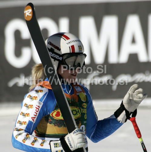 : Jessica Lindell-Vikarby of Sweden reacts in finish of Women super-g race of Audi FIS alpine skiing World Cup 2010-2011 in Tarvisio, Italy. Women super-g race of Audi FIS alpine skiing World Cup 2010-2011, was held on Sunday, 6th of March 2011, in Tarvisio, Italy.