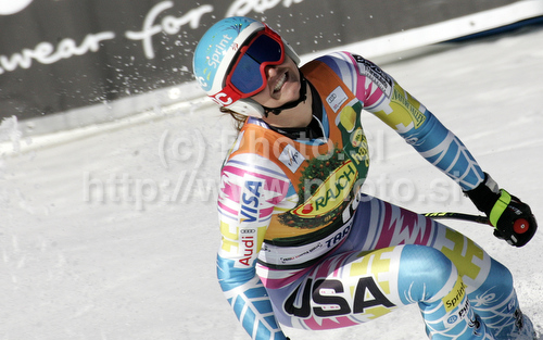 : Julia Mancuso of USA reacts in finish of Women super-g race of Audi FIS alpine skiing World Cup 2010-2011 in Tarvisio, Italy. Women super-g race of Audi FIS alpine skiing World Cup 2010-2011, was held on Sunday, 6th of March 2011, in Tarvisio, Italy.