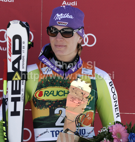Tarvisio ,Italy - 06.03.2011 : Maria Riesch of Germany celebrates her medal won in Women super-g race of Audi FIS alpine skiing World Cup 2010-2011 in Tarvisio, Italy. Women super-g race of Audi FIS alpine skiing World Cup 2010-2011, was held on Sunday, 6th of March 2011, in Tarvisio, Italy. Photo by: Tomaz Jeroncic