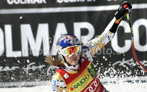 : Lindsey Vonn of USA reacts in finish of Women super-g race of Audi FIS alpine skiing World Cup 2010-2011 in Tarvisio, Italy. Women super-g race of Audi FIS alpine skiing World Cup 2010-2011, was held on Sunday, 6th of March 2011, in Tarvisio, Italy.
