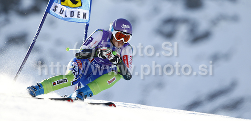: Tina Maze of Slovenia skiing in first run of women giant slalom race of Audi FIS Alpine skiing World cup in Soelden, Austria. First race of season 2011-2012 was held on Rettenbach glacier above Soelden, Austria, on Saturday, 22nd of October 2011.