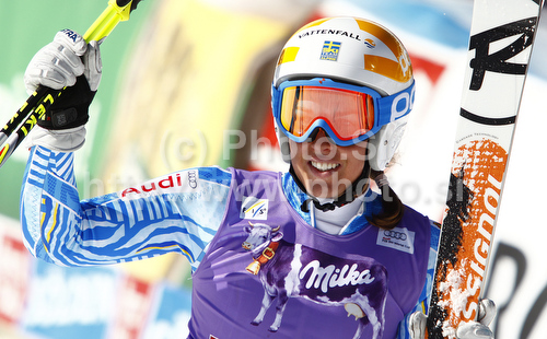 : Fifth placed Maria Pietilae-Holmner of Sweden reacts in finish of second run of women giant slalom race of Audi FIS Alpine skiing World cup in Soelden, Austria. First race of season 2011-2012 was held on Rettenbach glacier above Soelden, Austria, on Saturday, 22nd of October 2011.