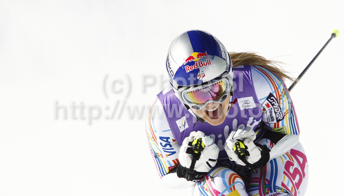 : Winner Lindsey Vonn of USA reacts in finish of second run of women giant slalom race of Audi FIS Alpine skiing World cup in Soelden, Austria. First race of season 2011-2012 was held on Rettenbach glacier above Soelden, Austria, on Saturday, 22nd of October 2011.