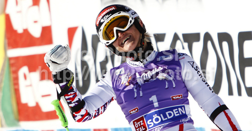 Soelden ,Austria - 22.10.2011 : Third placed Elisabeth Goergl of Austria reacts in finish of second run of women giant slalom race of Audi FIS Alpine skiing World cup in Soelden, Austria. First race of season 2011-2012 was held on Rettenbach glacier above Soelden, Austria, on Saturday, 22nd of October 2011. Photo by: Primoz Jeroncic
