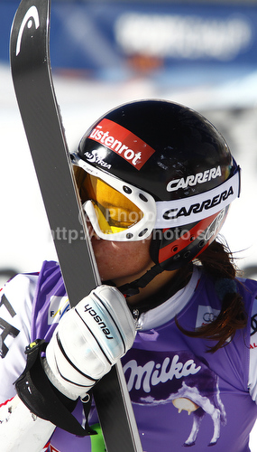 : Third placed Elisabeth Goergl of Austria reacts in finish of second run of women giant slalom race of Audi FIS Alpine skiing World cup in Soelden, Austria. First race of season 2011-2012 was held on Rettenbach glacier above Soelden, Austria, on Saturday, 22nd of October 2011.