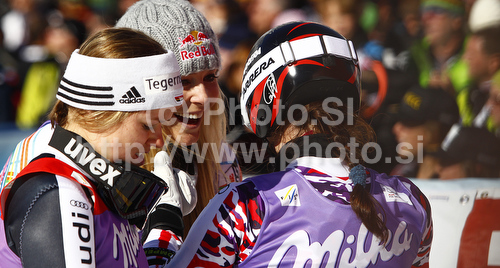 : Second placed Viktoria Rebensburg of Germany (L), winner Lindsey Vonn of USA (M) and third placed Elisabeth Goergl of Austria (R) in finish of second run of women giant slalom race of Audi FIS Alpine skiing World cup in Soelden, Austria. First race of season 2011-2012 was held on Rettenbach glacier above Soelden, Austria, on Saturday, 22nd of October 2011.