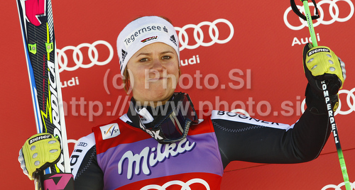 : Second placed Viktoria Rebensburg of Germany celebrates her medal won in women giant slalom race of Audi FIS Alpine skiing World cup in Soelden, Austria. First race of season 2011-2012 was held on Rettenbach glacier above Soelden, Austria, on Saturday, 22nd of October 2011.