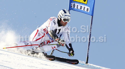 : Romed Baumann of Austria skiing in first run of men giant slalom race of Audi FIS Alpine skiing World cup in Soelden, Austria. First race of men season 2011-2012 was held on Rettenbach glacier above Soelden, Austria, on Sunday, 23rd of October 2011.