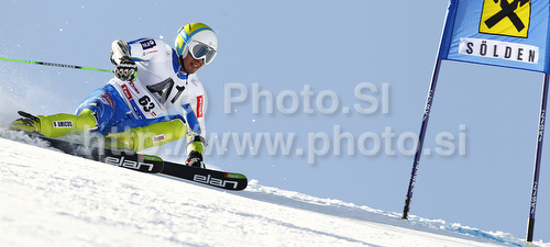 : Janez Jazbec of Slovenia skiing in first run of men giant slalom race of Audi FIS Alpine skiing World cup in Soelden, Austria. First race of men season 2011-2012 was held on Rettenbach glacier above Soelden, Austria, on Sunday, 23rd of October 2011.