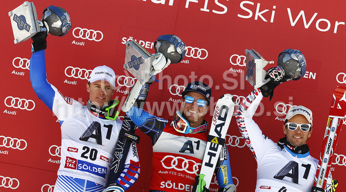 : Winner Ted Ligety of USA (M), second placed Alexis Pinturault of France (L) and third placed Philipp Schoerghofer of Austria (R) celebrate their medals won in men giant slalom race of Audi FIS Alpine skiing World cup in Soelden, Austria. First race of men season 2011-2012 was held on Rettenbach glacier above Soelden, Austria, on Sunday, 23rd of October 2011.