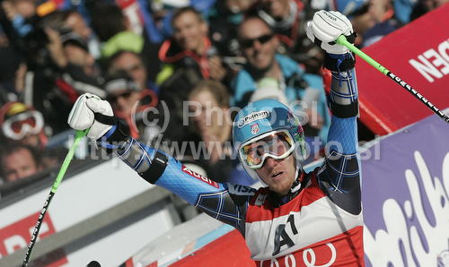 : Winner Ted Ligety of USA reacts in finish of second run of men giant slalom race of Audi FIS Alpine skiing World cup in Soelden, Austria. First race of men season 2011-2012 was held on Rettenbach glacier above Soelden, Austria, on Sunday, 23rd of October 2011.