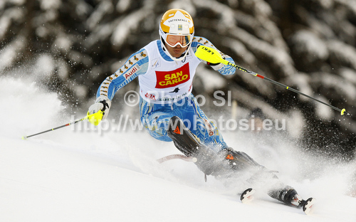 : Andre Myhrer of Sweden skiing in first run of men slalom race of Audi FIS Alpine skiing World cup in Alta Badia, Italy. Men slalom race of Audi FIS Alpine skiing World cup was held on Gran Risa course in Alta Badia, Italy on Monday, 19th of December 2011.
