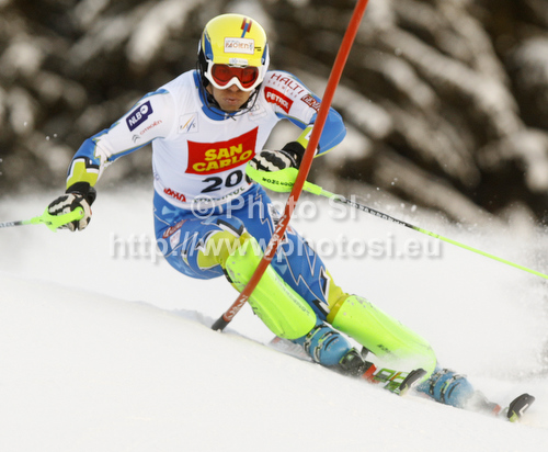 : Mitja Valencic of Slovenia skiing in first run of men slalom race of Audi FIS Alpine skiing World cup in Alta Badia, Italy. Men slalom race of Audi FIS Alpine skiing World cup was held on Gran Risa course in Alta Badia, Italy on Monday, 19th of December 2011.