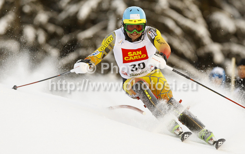 : Trevor White of Canada skiing in first run of men slalom race of Audi FIS Alpine skiing World cup in Alta Badia, Italy. Men slalom race of Audi FIS Alpine skiing World cup was held on Gran Risa course in Alta Badia, Italy on Monday, 19th of December 2011.