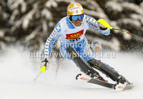 : Anton Lahdenperae of Sweden skiing in first run of men slalom race of Audi FIS Alpine skiing World cup in Alta Badia, Italy. Men slalom race of Audi FIS Alpine skiing World cup was held on Gran Risa course in Alta Badia, Italy on Monday, 19th of December 2011.