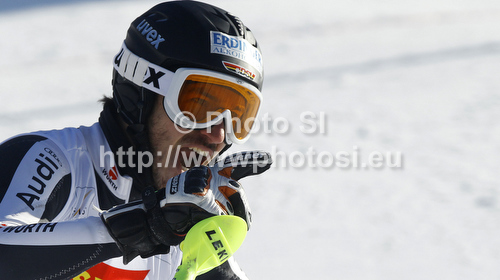 : Third placed Felix Neureuther of Germany reacts in finish of second run of men slalom race of Audi FIS Alpine skiing World cup in Alta Badia, Italy. Men slalom race of Audi FIS Alpine skiing World cup was held on Gran Risa course in Alta Badia, Italy on Monday, 19th of December 2011.