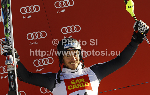 Alta Badia ,Italy - 19.12.2011 : Third placed Felix Neureuther of Germany celebrates his medal won in men slalom race of Audi FIS Alpine skiing World cup in Alta Badia, Italy. Men slalom race of Audi FIS Alpine skiing World cup was held on Gran Risa course in Alta Badia, Italy on Monday, 19th of December 2011. Photo by: Primoz Jeroncic