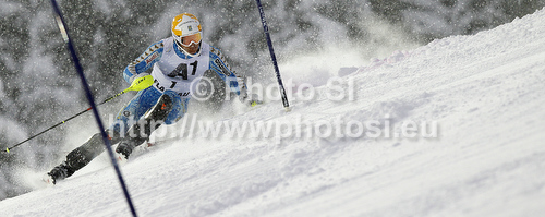 : Andre Myhrer of Sweden skiing in first run of men slalom race of Audi FIS Alpine skiing World cup in Flachau, Austria. Men slalom race of Audi FIS Alpine skiing World cup, which replaced canceled Levi race, was held in Flachau, Austria on Wednesday, 21st of December 2011.