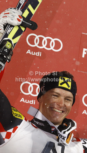 Flachau ,Austria - 21.12.2011 : Winner Ivica Kostelic of Croatia celebrates his medal won in men slalom race of Audi FIS Alpine skiing World cup in Flachau, Austria. Men slalom race of Audi FIS Alpine skiing World cup, which replaced canceled Levi race, was held in Flachau, Austria on Wednesday, 21st of December 2011. Photo by: Primoz Jeroncic