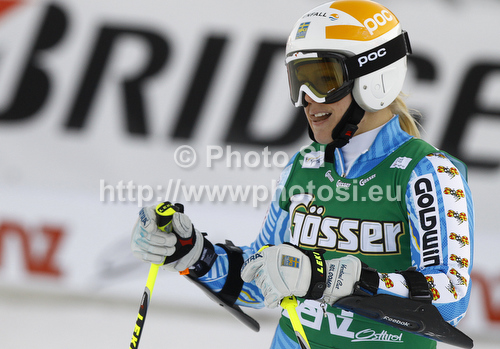 : Jessica Lindell-Vikarby of Sweden reacts in finish run of women giant slalom race of Audi FIS Alpine skiing World cup in Lienz, Austria. Women giant slalom race of Audi FIS Alpine skiing World cup was held in Lienz, Austria on Wednesday, 28th of December 2011.