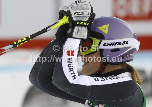 : Maria Hoefl-Riesch of Germany reacts in finish of second run of women giant slalom race of Audi FIS Alpine skiing World cup in Lienz, Austria. Women giant slalom race of Audi FIS Alpine skiing World cup was held in Lienz, Austria on Wednesday, 28th of December 2011.