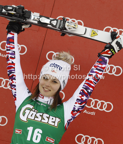 : Winner Anna Fenninger of Austria celebrates her medal won in women giant slalom race of Audi FIS Alpine skiing World cup in Lienz, Austria. Women giant slalom race of Audi FIS Alpine skiing World cup was held in Lienz, Austria on Wednesday, 28th of December 2011.