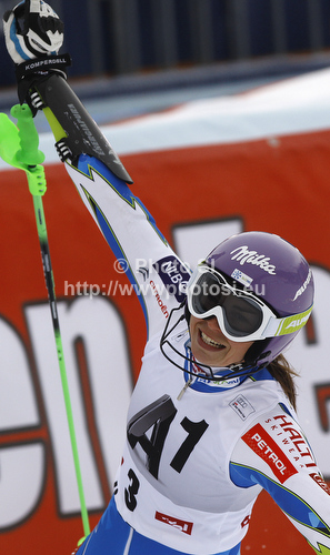 : Second placed Tina Maze of Slovenia reacts in finish of second run of women slalom race of Audi FIS Alpine skiing World cup in Lienz, Austria. Women slalom race of Audi FIS Alpine skiing World cup was held in Lienz, Austria on Thursday, 29th of December 2011.