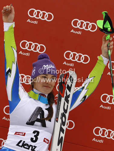 Lienz ,Austria - 29.12.2011 : Second placed Tina Maze of Slovenia celebrates her medal won in women slalom race of Audi FIS Alpine skiing World cup in Lienz, Austria. Women slalom race of Audi FIS Alpine skiing World cup was held in Lienz, Austria on Thursday, 29th of December 2011. Photo by: Primoz Jeroncic