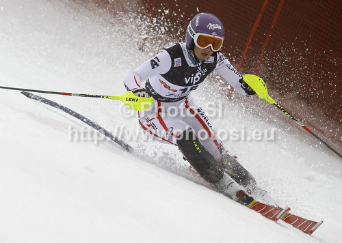 : Michaela Kirchgasser of Austria skiing in first run of women slalom race of Audi FIS Alpine skiing World cup in Zagreb, Croatia. Women slalom race of Audi FIS Alpine skiing World cup was held on Sljeme above Zagreb, Croatia, on Tuesday, 3rd of January 2012.