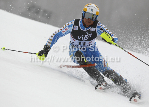 : Mattias Hargin of Sweden skiing in first run of men slalom race of Audi FIS Alpine skiing World cup in Zagreb, Croatia. Men slalom race of Audi FIS Alpine skiing World cup was held on Sljeme above Zagreb, Croatia, on Thursday, 5th of January 2012.