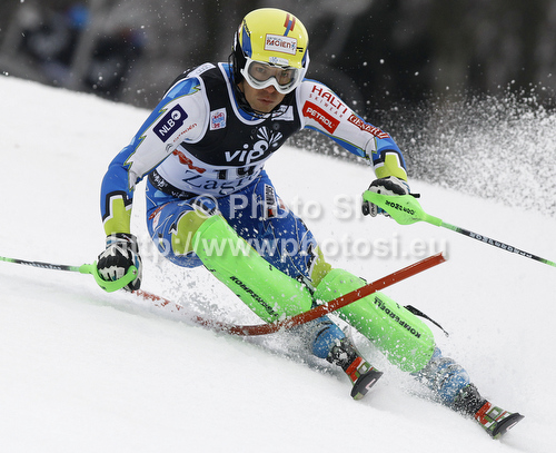 : Mitja Valencic of Slovenia skiing in first run of men slalom race of Audi FIS Alpine skiing World cup in Zagreb, Croatia. Men slalom race of Audi FIS Alpine skiing World cup was held on Sljeme above Zagreb, Croatia, on Thursday, 5th of January 2012.