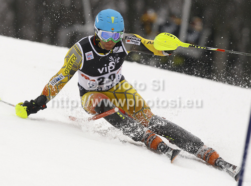 : Michael Janyk of Canada skiing in first run of men slalom race of Audi FIS Alpine skiing World cup in Zagreb, Croatia. Men slalom race of Audi FIS Alpine skiing World cup was held on Sljeme above Zagreb, Croatia, on Thursday, 5th of January 2012.