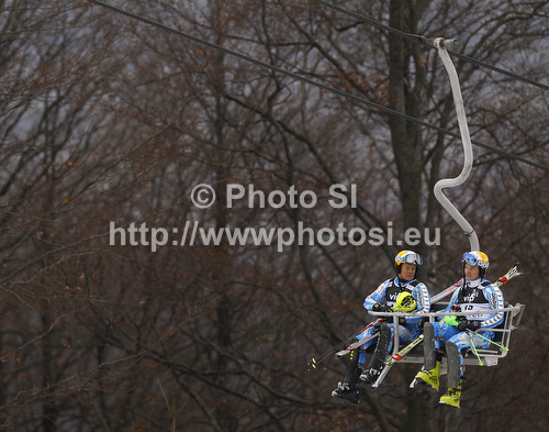 : Mattias Hargin of Sweden (L) and his teammate Jens Byggmark (R) riding on ski lift back to start during first run of men slalom race of Audi FIS Alpine skiing World cup in Zagreb, Croatia. Men slalom race of Audi FIS Alpine skiing World cup was held on Sljeme above Zagreb, Croatia, on Thursday, 5th of January 2012.