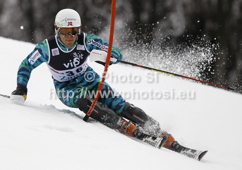 : Lars Elton Myhre of Norway skiing in first run of men slalom race of Audi FIS Alpine skiing World cup in Zagreb, Croatia. Men slalom race of Audi FIS Alpine skiing World cup was held on Sljeme above Zagreb, Croatia, on Thursday, 5th of January 2012.