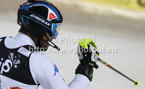: Fourth placed Cristian Deville of Italy reacts in finish of second run of men slalom race of Audi FIS Alpine skiing World cup in Zagreb, Croatia. Men slalom race of Audi FIS Alpine skiing World cup was held on Sljeme above Zagreb, Croatia, on Thursday, 5th of January 2012.