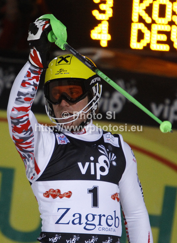 Zagreb ,Croatia - 05.01.2012 : Winner Marcel Hirscher of Austria reacts in finish of second run of men slalom race of Audi FIS Alpine skiing World cup in Zagreb, Croatia. Men slalom race of Audi FIS Alpine skiing World cup was held on Sljeme above Zagreb, Croatia, on Thursday, 5th of January 2012. Photo by: Primoz Jeroncic