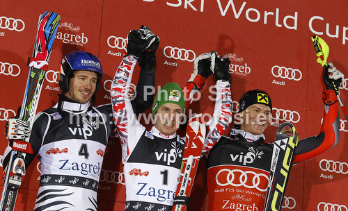 : Winner Marcel Hirscher of Austria (M), second placed Felix Neureuther of Germany (L) and third placed Ivica Kostelic of Croatia (R) celebrate their medals won in men slalom race of Audi FIS Alpine skiing World cup in Zagreb, Croatia. Men slalom race of Audi FIS Alpine skiing World cup was held on Sljeme above Zagreb, Croatia, on Thursday, 5th of January 2012.
