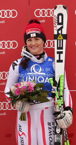 : Winner Elisabeth Goergl of Austria celebrates her medal won in the Women Downhill race of Audi FIS alpine skiing World Cup in Bad Kleinkirchheim, Austria. Women Downhill race of Women Audi FIS Alpine skiing World Cup 2011 / 2012, was held on Saturday, 7th of Januar 2012, on Kaernten _Franz Klammer course in Bad Kleinkirchheim, Austria.