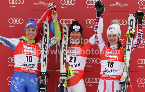 : Winner Fabienne Suter of Switzerland (middle), second placed Tina Maze of Slovenia (left) and third placed Anna Fenninger of Austria (right) celebrate their medals won in the Women Super G race of Audi FIS alpine skiing World Cup in Bad Kleinkirchheim, Austria. Women Super G race of Women Audi FIS Alpine skiing World Cup 2011 / 2012, was held on Sunday, 8th of Januar 2012, on Kaernten - Franz Klammer course in Bad Kleinkirchheim, Austria.