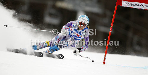 Kranjska Gora ,Slovenia - 21.01.2012 : Julia Mancuso of USA skiing in first run of women giant slalom race of Audi FIS Alpine skiing World cup in Kranjska Gora, Slovenia. Traditional Golden fox trophy women giant slalom race of Audi FIS Alpine skiing World cup, which was scheduled to be run in Maribor, Slovenia, was moved to Kranjska Gora, Slovenia, due warm weather and lack of snow in Maribor, and was held in Kranjska Gora, Slovenia, on Saturday, 21st of January 2012. Photo by: Primoz Jeroncic