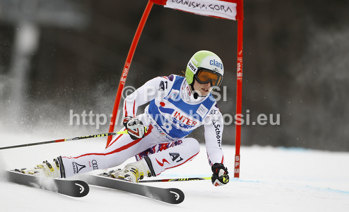 : Anna Fenninger of Austria skiing in first run of women giant slalom race of Audi FIS Alpine skiing World cup in Kranjska Gora, Slovenia. Traditional Golden fox trophy women giant slalom race of Audi FIS Alpine skiing World cup, which was scheduled to be run in Maribor, Slovenia, was moved to Kranjska Gora, Slovenia, due warm weather and lack of snow in Maribor, and was held in Kranjska Gora, Slovenia, on Saturday, 21st of January 2012.