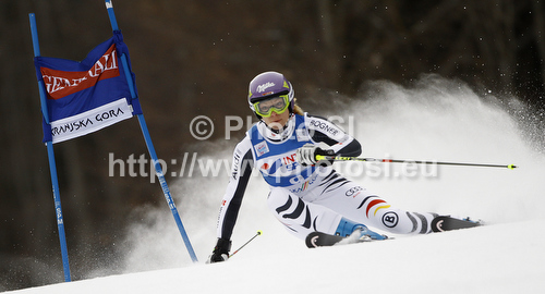 : Maria Hoefl-Riesch of Germany skiing in first run of women giant slalom race of Audi FIS Alpine skiing World cup in Kranjska Gora, Slovenia. Traditional Golden fox trophy women giant slalom race of Audi FIS Alpine skiing World cup, which was scheduled to be run in Maribor, Slovenia, was moved to Kranjska Gora, Slovenia, due warm weather and lack of snow in Maribor, and was held in Kranjska Gora, Slovenia, on Saturday, 21st of January 2012.