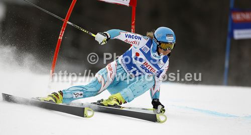: Tanja Poutiainen of Finland skiing in first run of women giant slalom race of Audi FIS Alpine skiing World cup in Kranjska Gora, Slovenia. Traditional Golden fox trophy women giant slalom race of Audi FIS Alpine skiing World cup, which was scheduled to be run in Maribor, Slovenia, was moved to Kranjska Gora, Slovenia, due warm weather and lack of snow in Maribor, and was held in Kranjska Gora, Slovenia, on Saturday, 21st of January 2012.